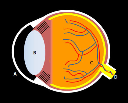 A = Cornea B = Lens C = Retina D = Optic nerve
